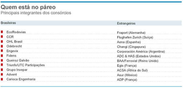 Onze consórcios entregaram propostas para o leilão de concessão dos aeroportos de Guarulhos (SP), Campinas (SP) e Brasília (DF), que deve ocorrer hoje. Ao todo, os vencedores da concessão terão que investir mais de R$ 16 bilhões ao longo do período de contrato – que chega a 30 anos, dependendo do caso. Veja abaixo os principais concorrentes: