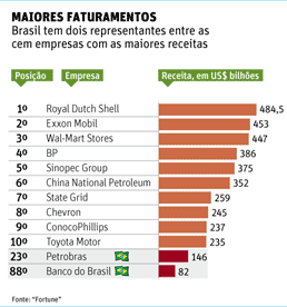 As oito empresas brasileiras listadas no ranking anual das 500 maiores companhias do mundo, elaborado pela revista Fortune, ganharam mais de 10 posições em relação à lista de 2011. A Petrobras, no 23° posto, subiu 11 posições e é a empresa brasileira mais bem colocada. A receita da Petrobras subiu 21,5% de 2010 para 2011, alcançando US$ 145,9 bilhões. Com receita de US$ 81,9 bilhões, o Banco do Brasil alcançou a 88ª posição, ante a 117ª do ano passado. Depois, aparecem Bradesco no 136° lugar (156° em 2011) e Vale na 159ª posição (186ª). O frigorífico JBS, no 286° lugar, avançou 21 posições. Com receita de US$ 37,7 bilhões, a Itaúsa avançou 49 degraus no ranking e chegou à 311ª colocação neste ano. A Ultrapar ficou no 380° lugar e o Pão de Açúcar, debutante na lista, na 399ª posição.