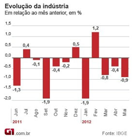 A produção da indústria brasileira registrou queda de 0,9% em maio, na comparação com abril, segundo o IBGE. No acumulado do ano, o setor acumula queda de 3,4%. De abril para maio, a atividade fabril recuou em 14 dos 27 ramos investigados, com os principais destaques partindo de veículos automotores (-4,5%), que vinha crescendo nos últimos três meses, e de alimentos (-3,4%).