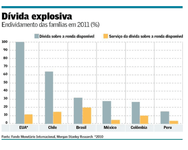 O Fundo Monetário Internacional vê riscos na expansão do crédito e aponta indícios em algumas classes de ativos, especialmente nos empréstimos às famílias e no setor imobiliário, que poderiam levar à formação de bolhas. De acordo com dados citados pelo órgão, o endividamento do brasileiro não está entre os mais altos, hoje na casa dos 30% de toda a renda disponível. Entretanto, o nível de comprometimento da renda com os serviços da dívida está entre os maiores do continente americano. Aqui, 23% da renda mensal das famílias é gasta com o pagamento de juros e a amortização da dívida, enquanto no México, na Colômbia e no Peru essa relação está ao redor ou abaixo de 10%.