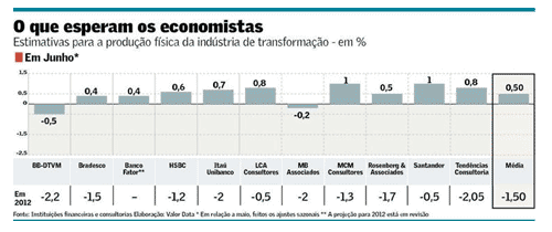 As medidas de estímulo à indústria concedidas pelo governo, o ciclo de queda da taxa de juros e a desvalorização do real devem dar algum alívio, ainda que modesto, para a indústria em junho. A média de projeções coletadas pelo Valor Data entre 11 instituições aponta o crescimento de 0,5% da produção industrial em junho, na comparação com maio. Ao longo do segundo semestre, os economistas esperam que os estímulos continuem a fazer efeito e resultem em um cenário mais favorável para a indústria. No entanto, como o desempenho nos primeiros cinco meses do ano foi bastante negativo, para 2012, a média das projeções de dez instituições coletadas pelo Valor Data é de queda de 1,5% da produção industrial.