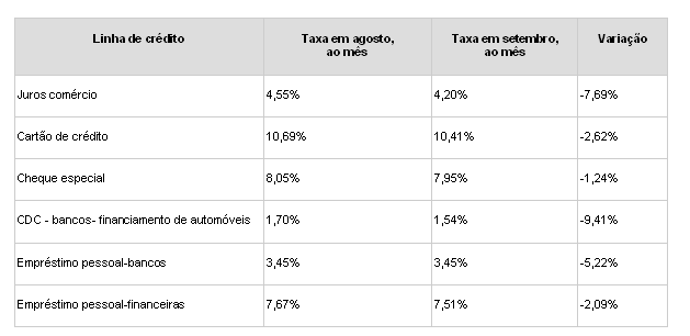 A taxa de juros média para pessoa física caiu 0,21% no mês de setembro, passando de 6,02% (101,68% ao ano), no mês anterior, para 5,81% (96,93% ao ano), o menor patamar da série histórica (iniciada em 1995). Esta também é a primeira vez que o patamar é inferior a 100% ao ano, de acordo com levantamento da Associação Nacional de Executivos de Finanças, Administração e Contabilidade (Anefac).