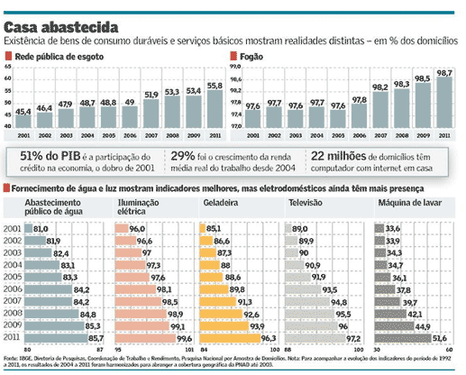 Nos últimos 10 anos, o ganho de renda dos brasileiros e a forte expansão do crédito elevaram o poder de compra da população, fazendo do Brasil o oitavo maior mercado consumidor entre 142 países pesquisados, segundo o Fórum Econômico Mundial, e levaram a presença de televisores e geladeiras a superar 96% dos domicílios brasileiros. Por outro lado, a oferta de serviços básicos, dependente principalmente de investimentos públicos, alcança porcentagens bastante inferiores da população. O acesso ao saneamento básico, por exemplo, chega a apenas 55,8% dos domicílios e 31,1% ainda não têm pavimentação na rua, de acordo com dados da Pesquisa Nacional por Amostra de Domicílio (Pnad) e da Pesquisa de Orçamentos Familiares 2008-2009 (POF), do IBGE.