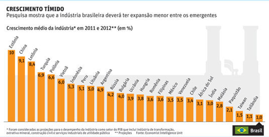 Projeções da consultoria britânica EIU (Economist Intelligence Unit) indicam que a indústria brasileira teve ter uma expansão média de 1% em 2011 e 2012, o pior desempenho entre 26 países emergentes. Isso deixa o país atrás de gigantes como China (9,1%) e Índia (3%), de vizinhos latino-americanos como Peru (5,1%) e México (3,5%), e até de nações emergentes europeias, que enfrentam a grave crise que afeta o continente.