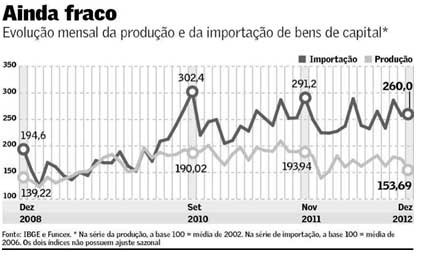 Depois de cinco trimestres seguidos de queda do investimento, o consumo doméstico de máquinas continuou estagnado no último trimestre. As projeções para a evolução do consumo de bens de capital oscilam entre menos 1% e mais 1%. O volume importado desses itens subiu em relação ao terceiro trimestre, mas a produção interna, prejudicada por acúmulo excessivo de estoques, seguiu negativa no período.