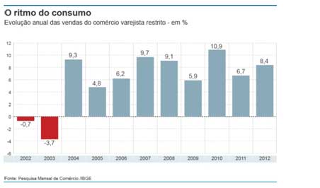 As vendas do comércio destoaram dos demais setores da economia e cresceram 8,4% em 2012, segundo a Pesquisa Mensal do Comércio do IBGE. Em dezembro, porém, as vendas caíram 0,5% na comparação com novembro. Foi a primeira queda após seis meses de crescimento. De acordo com o IBGE, o principal motivo para o resultado positivo foi o aumento do poder de compra provocado pelo crescimento da renda e do emprego. E, no caso do segmento dos móveis e eletrodomésticos, a redução do IPI para a linha branca, desde dezembro de 2011, e para móveis, a partir de março também colaborou para a alta.