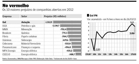 O aumento médio de 18% no preço dos combustíveis e a desvalorização de 17% do real em relação ao dólar contribuíram para que a Gol Linhas Aéreas tivesse em 2012 o maior prejuízo de seus 12 anos de história, de R$ 1,51 bilhão. Foi o pior resultado divulgado por uma empresa de capital aberto até agora no país. Entre os maiores resultados negativos do ano passado vêm em seguida duas empresas de Eike Batista: a OGX, com perdas de R$ 1,17 bilhão, e a MMX, com R$ 792,4 milhões.