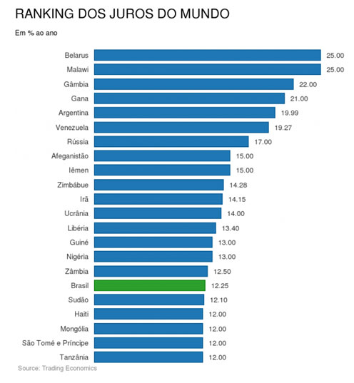 Recém-elevada para 12,25% ao ano, a taxa de juros brasileira é agora a 17ª maior do mundo. Com a alta promovida pelo Banco Central, o Brasil ultrapassou Sudão, Haiti, Mongólia, São Tomé e Príncipe e Tanzânia no ranking dos juros globais, segundo dados do site Trading Economics.