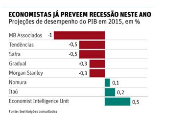 A combinação de fatores negativos (aumento de impostos, crise hídrica e energética, Operação Lava Jato e juros mais altos) freará tanto o consumo das famílias quanto o investimento privado, em um momento em que o governo também faz uma forte contenção de gastos, e deverá levar a economia brasileira para uma recessão em 2015. Economistas de grandes bancos e consultorias que até recentemente esperavam crescimento, ainda que modesto, passaram a última semana refazendo contas. Muitas das novas projeções já indicam provável contração do PIB entre 0,3% e 1%. Segundo analistas, há risco de queda maior do que 1% se houver racionamento de 10% ou mais na oferta de energia elétrica neste ano.