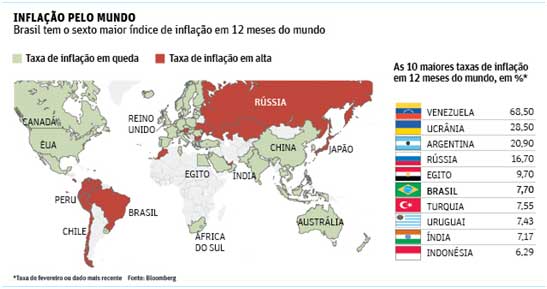 Com o IPCA alcançando 7,7% no mês passado, a taxa de inflação brasileira é atualmente a sexta mais alta do mundo (na comparação dos índices em 12 meses) e se destaca em um momento em que países ricos e até mesmo emergentes sofrem com o problema oposto: a deflação. Em fevereiro do ano passado, com o IPCA a 5,7%, o país ocupava a 13ª posição, em uma lista de 75 economias. Nesse período, foram deixados para trás países como Índia, Indonésia, África do Sul e até vizinhos como o Uruguai.